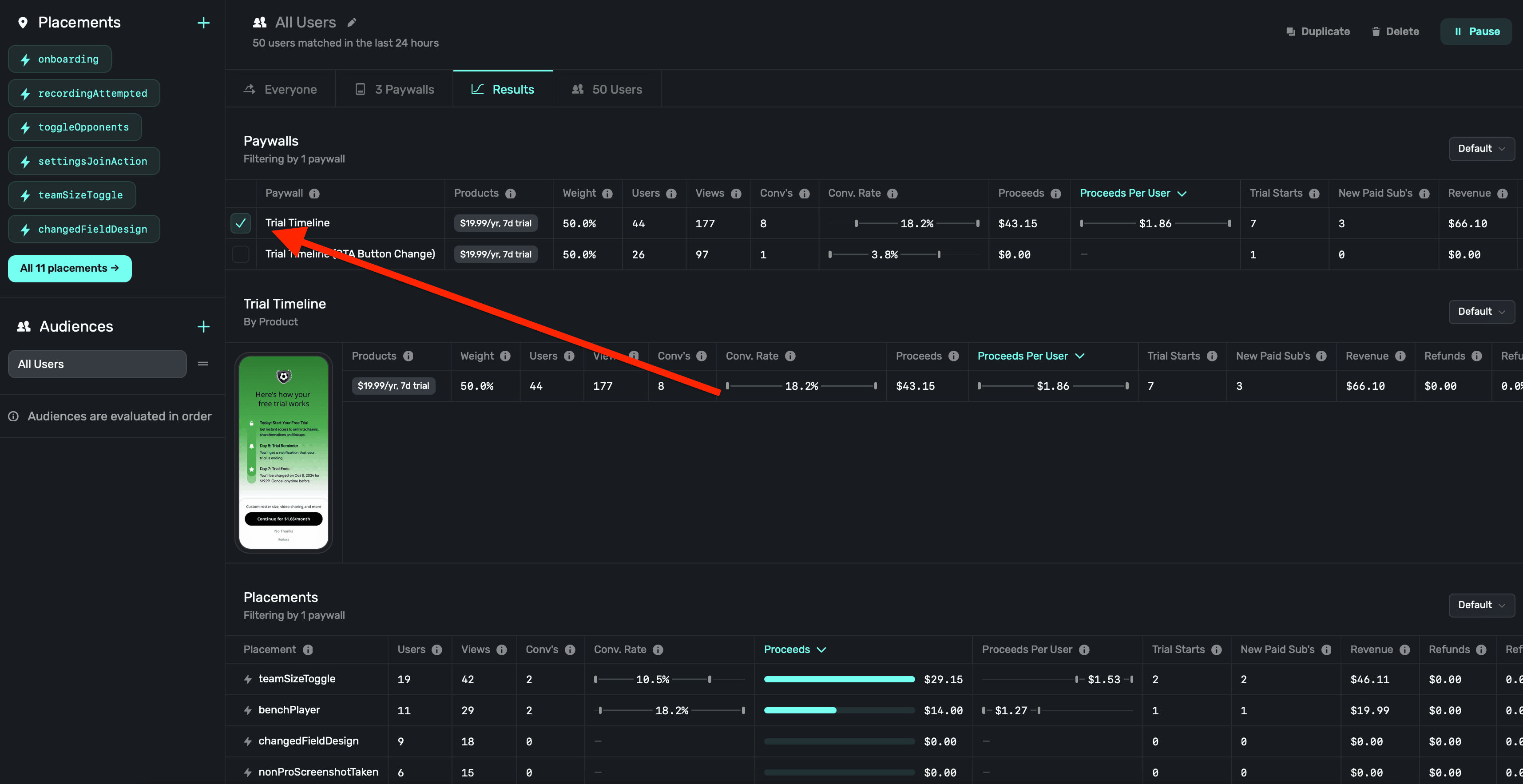 Here, you'll see each paywall being used (or that was used) in an experiment. Superwall will show you metrics such as proceeds, users and much more. There are several metric to explore, and you can hover over any of them to get more details about what each metric represents: