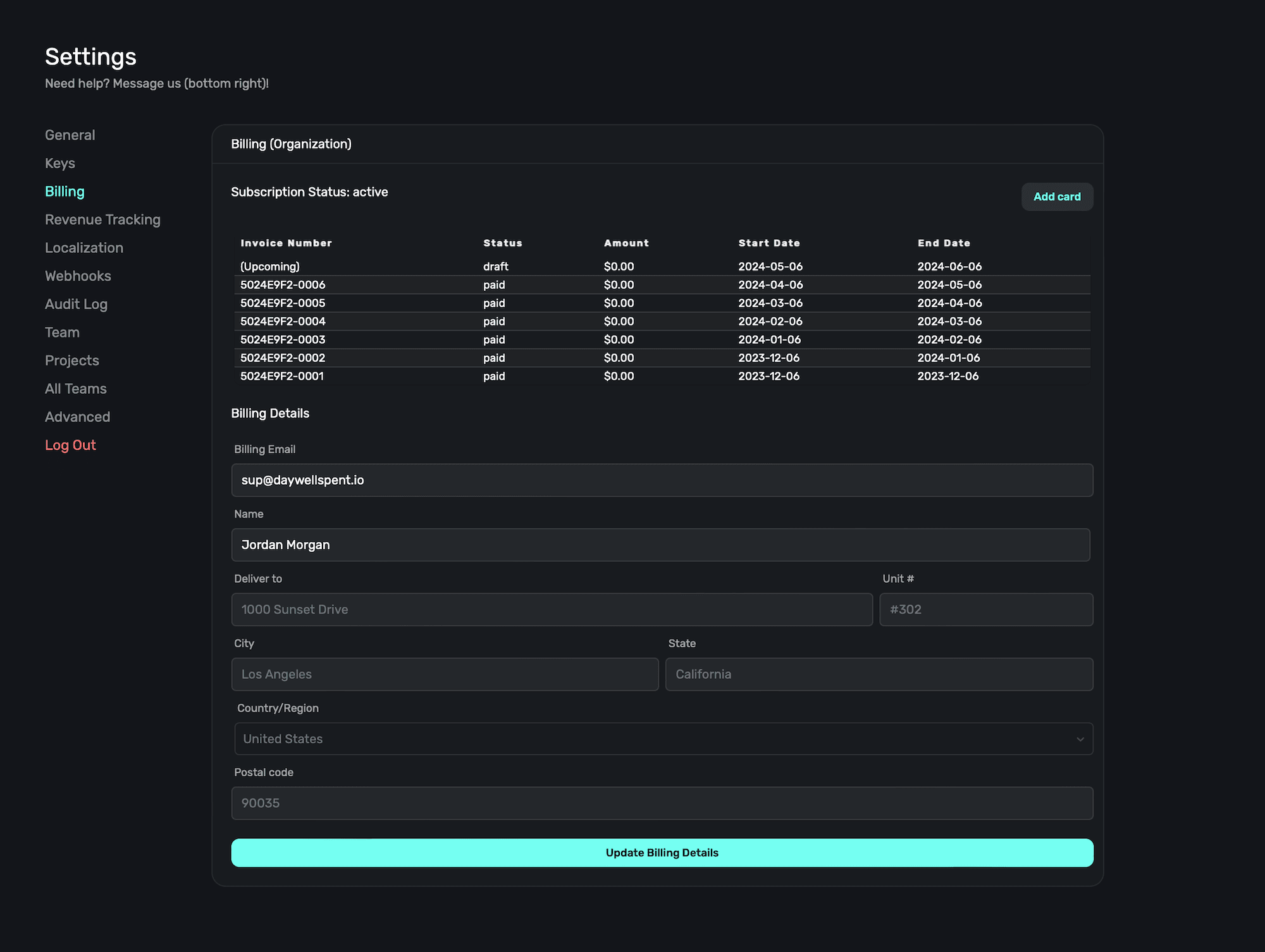 In the Billing section in Settings, you can enter, or change, billing details for your Superwall account: